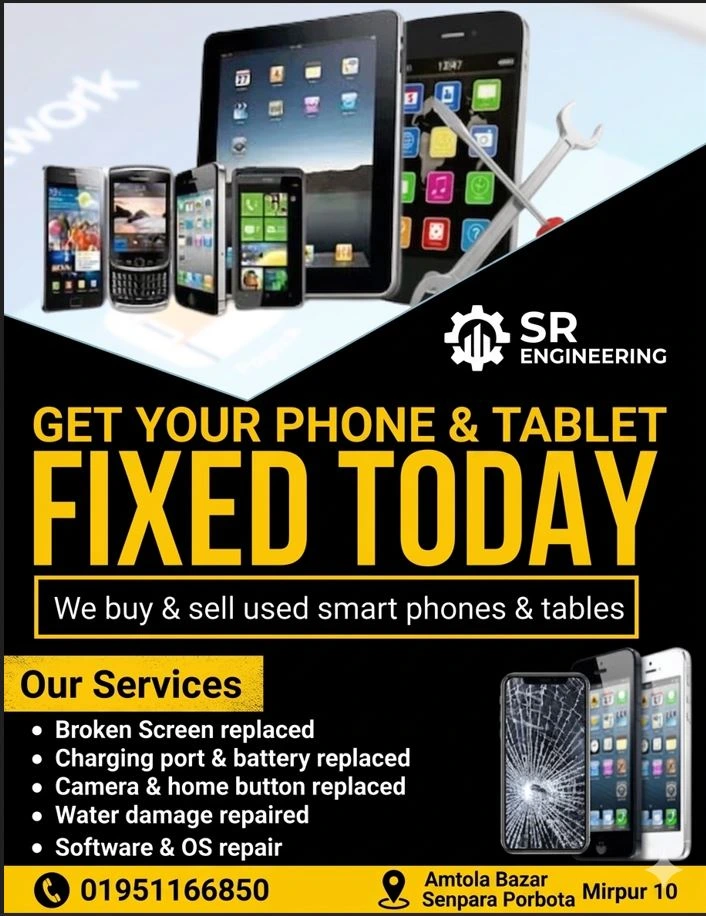 SR Engineering আপনাকে দিচ্ছে মোবাইল ও ট্যাবলেটের জন্য নির্ভরযোগ্য, পেশাদার এবং দ্রুত সার্ভিস। হার্ডওয়্যার রিপেয়ার থেকে সফটওয়্যার ট্রাবলশুটিং—আমাদের সার্টিফায়েড টেকনিশিয়ানরা আপনার ডিভাইসকে করে তোলে আগের মতোই নতুন।